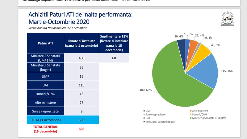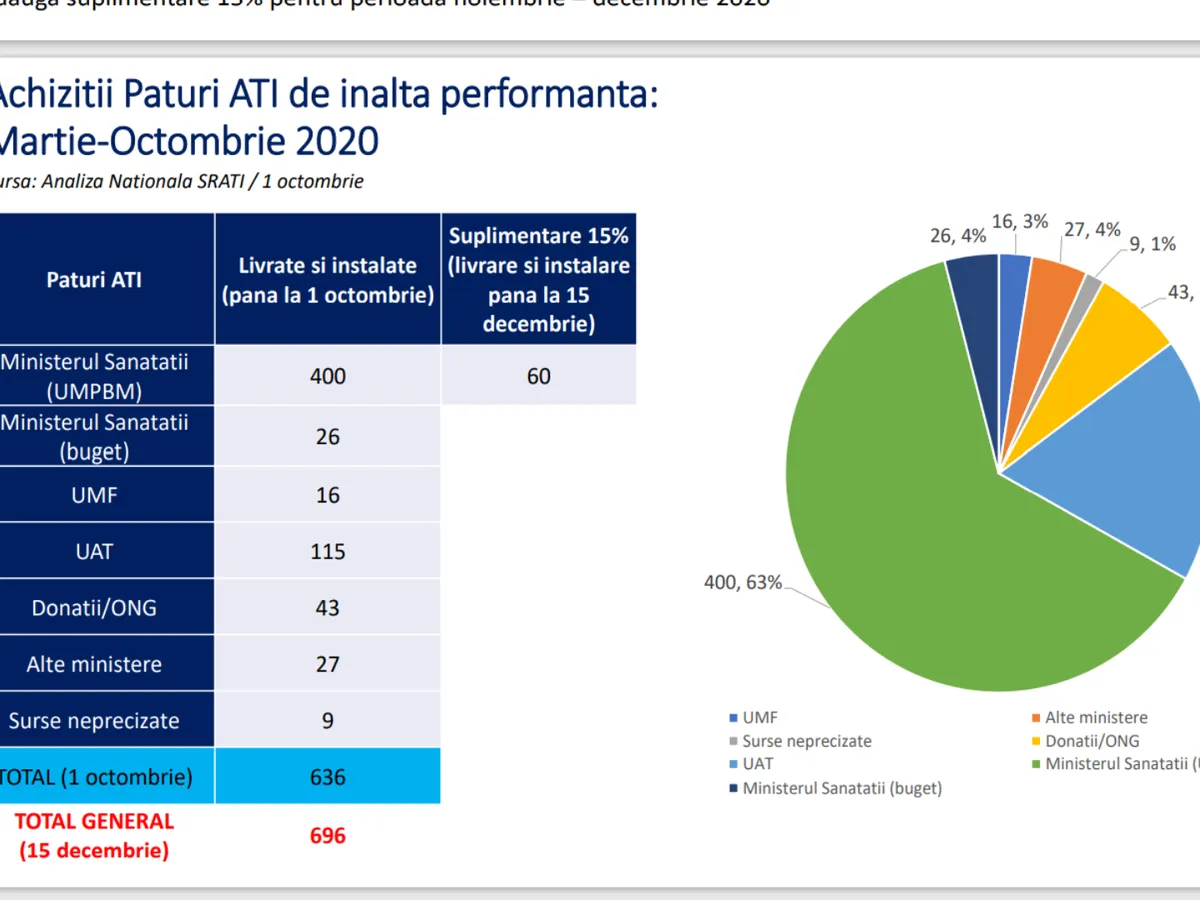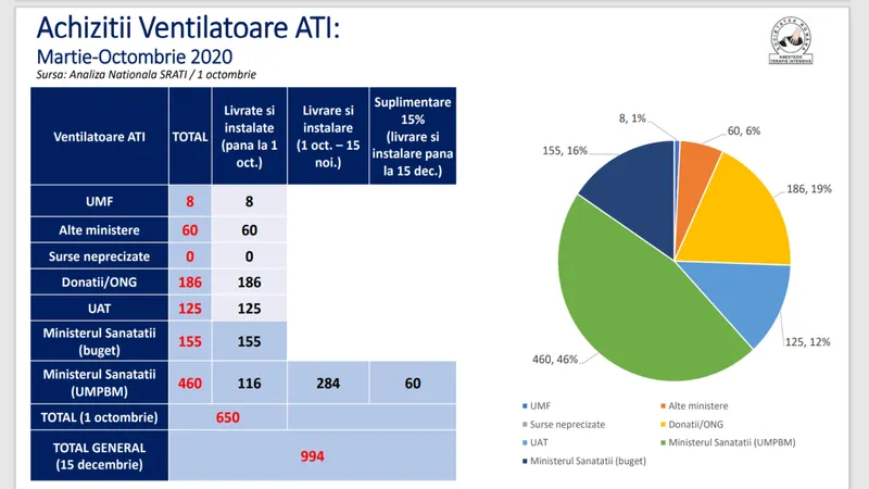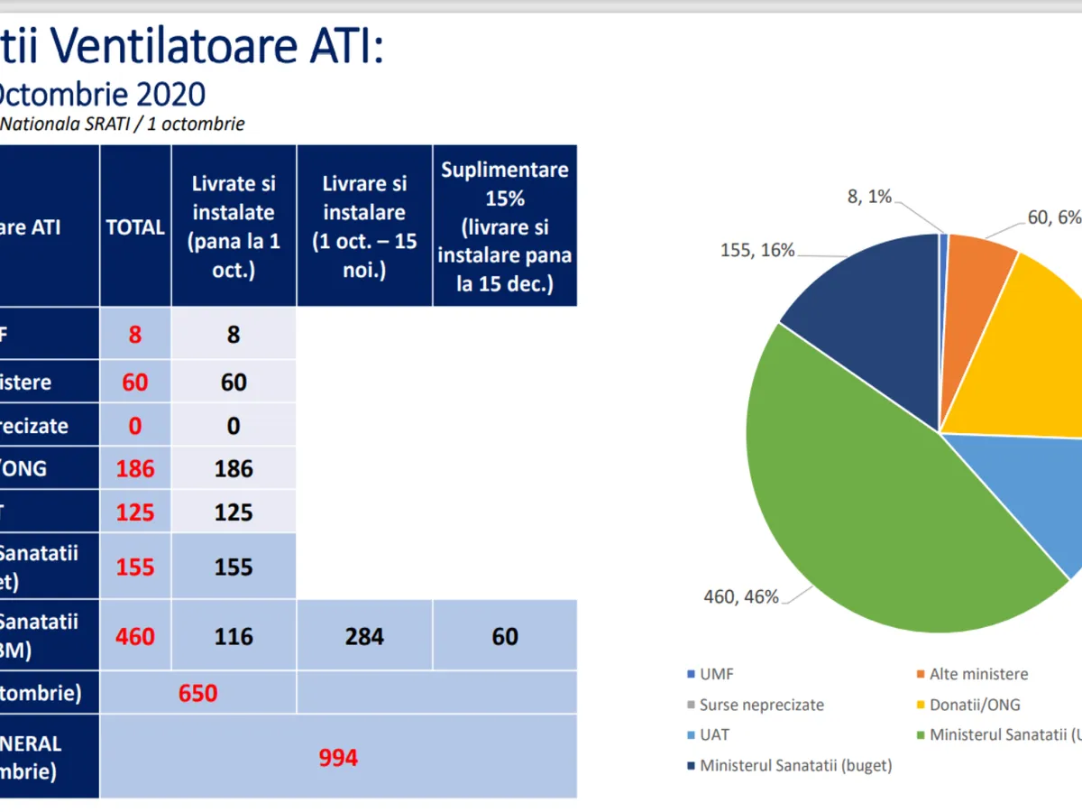 Potrivit statisticii realizate de Societatea Română de Anestezie și Terapie Intensivă (SRATI) consultată de Newsweek România, din momentul primului lockdown în martie 2020 și până în luna octombrie, România a achiziționat 650 de ventilatoare ATI, cele mai multe prin Ministerul Sănătății. Până la 15 decembrie au mai fost cumpărate alte 344.