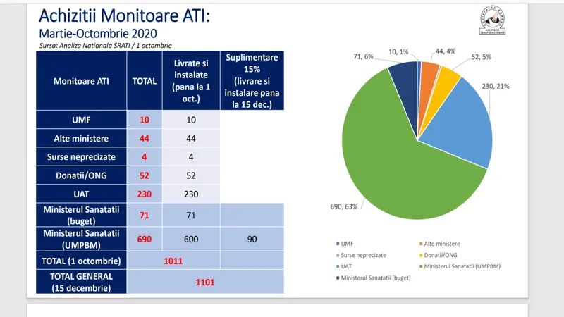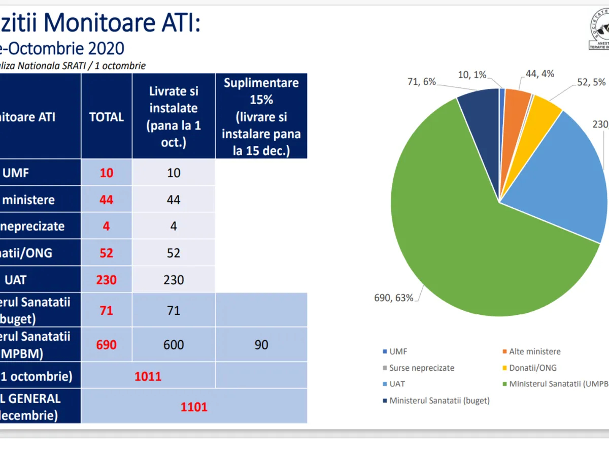 În cele nouă luni de pandemie de anul trecut au fost cumpărate 1.101 monitoare ATI, cele mai multe de către Ministerul Sănătății, dar au existat și 53 de donații, alte ministere contribuind la achiziția a 44 de monitoare ATI.