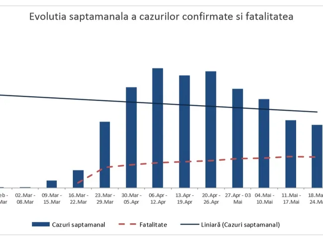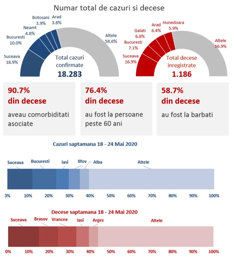 Analiza Centrului Național de Supraveghere și Control al Bolilor Transmisibile vorbește despre cele 18.283 de cazuri de infectare și 1.186 de decese, înregistrate până în 24 mai.
