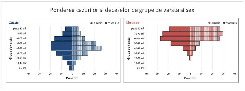 Referitor la ponderea deceselor pe grupe de vârstă şi sex, cele mai multe decese la femei erau asociate, până la 24 mai 2020, cu grupele de vârstă 70-79 ani (30%) şi 80 de ani peste (28%). La bărbaţi, categoriile de vârstă cele mai afectate de decese erau 60-69 ani (27%) şi 70-79 ani (25%)