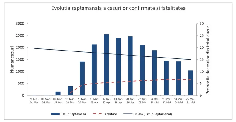 În săptămâna 25-31 mai 2020 s-a înregistrat cea mai mică creştere a numărului de îmbolnăviri noi de la o săptămână la alta din ultimele 10 săptămâni. Nivelul creşterii în această ultimă săptămână este mai mic decât în săptămâna 23-29 martie. Vârful creşterii cazurilor noi de la o săptămână la alta a fost înregistrat, în România, în intervalul 6-12 aprilie 2020, potrivit raportului.