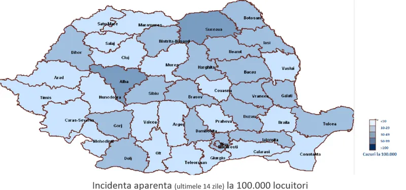 În ceea ce priveşte cazurile confirmate pe judeţe, în săptămâna 25-31 mai 2020, 43,7% din totalul cazurilor erau înregistrate în municipiul Bucureşti şi în judeţele Suceava, Bihor, Iaşi şi Botoşani. De asemenea, 46,2% dintre decese erau întâlnite în judeţele Suceava, Braşov, municipiul Bucureşti, judeţele Galaţi şi Iaşi.