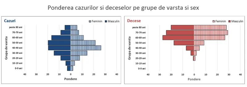 Analiza deceselor indică faptul că persoanele cu vârste cuprinse între 60-69 ani şi 70-79 ani şi peste 80 de ani sunt cele mai afectate: 27% (60-69 ani), 26% (70-79 ani) şi 23% (peste 80 de ani). Grupa de vârstă 50-59 ani are un procent de decese de 13,5%, în timp ce persoanele din categoria 40-49 ani au un procent de mortalitate de 6%. Nu s-au înregistrat, până la 31 mai 2020, cazuri de mortalitate la grupele de vârstă 0-9 şi 10-19 ani, conform sursei citate.