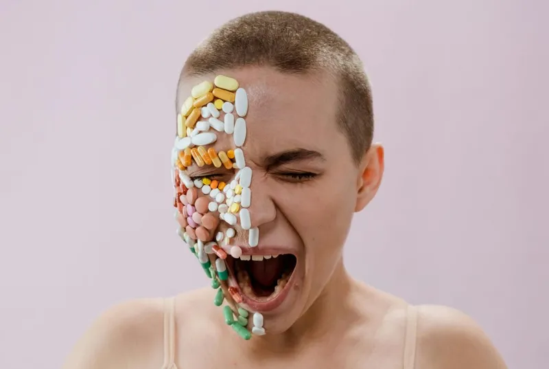 Femeie cu jumătatea dreaptă a obrazului acoperită de pastile de diferite culori - Foto: Pexels/cottonbro studio