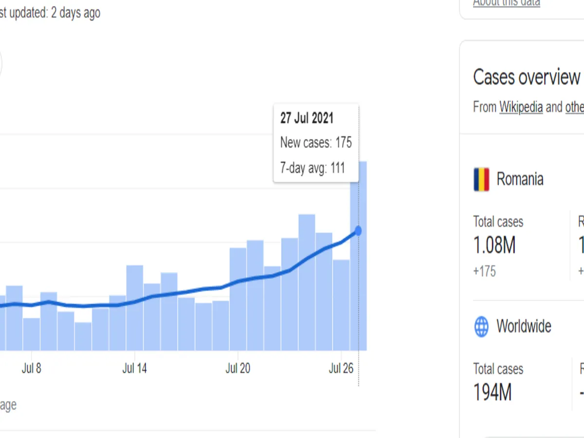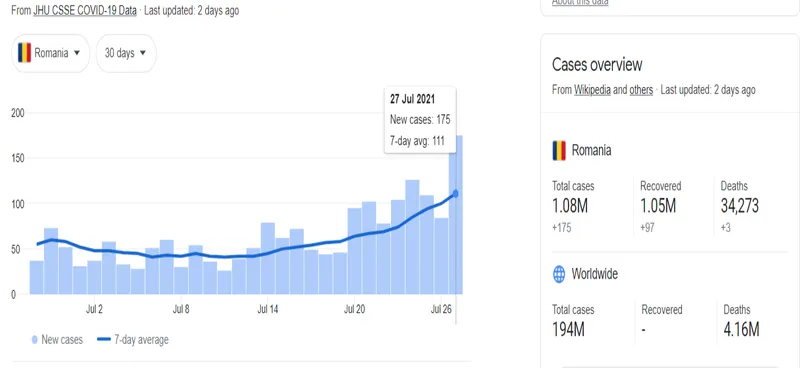 La început de iulie 2021, România înregistra un platou al infectărilor de 50 pe zi.