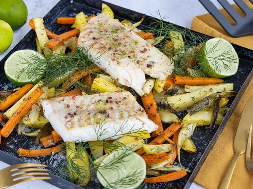 Cină: Friptură de cod copt cu cartofi prăjiți și broccoli / Cod la cuptor cu broccoli prăjit și cartofi wedges cu un pahar de vin roșu (cu moderație)