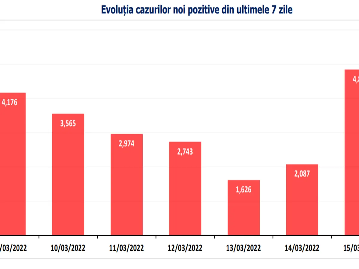 În ultimele 24 de ore au fost înregistrate 4.854 de cazuri noi de persoane infectate cu COVID, cu 2.767 mai multe decât în ziua anterioară. 595 dintre cazurile noi din 24 de ore sunt ale unor pacienți reinfectați.