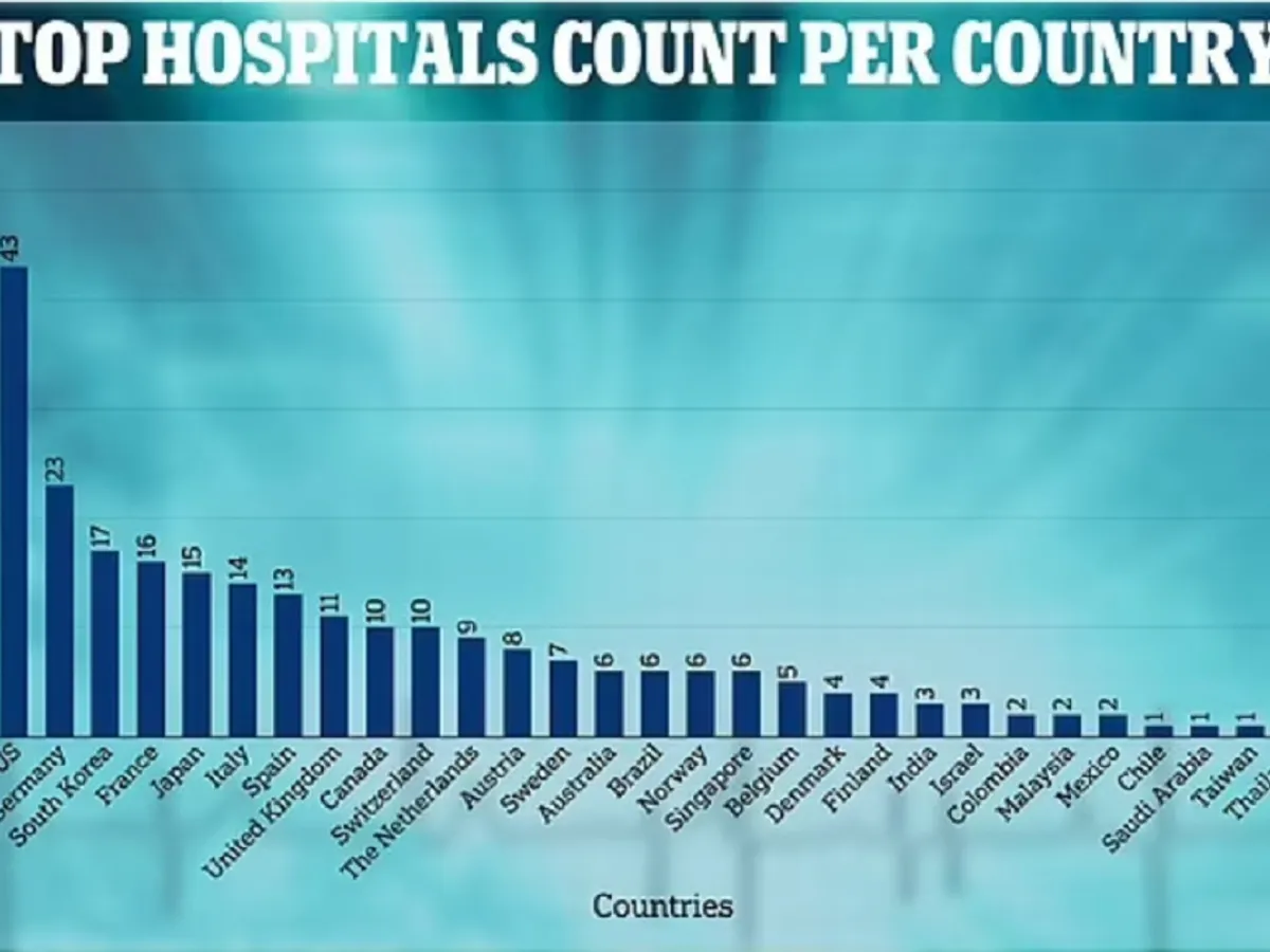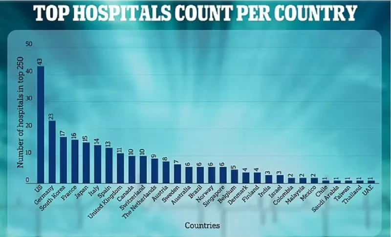 S-a descoperit că patru dintre primele cinci spitale din lume sunt în SUA și 43 din 250 americane - cu mult mai mult decât Germania pe locul doi, care are 23 de spitale în topul clasamentului.
