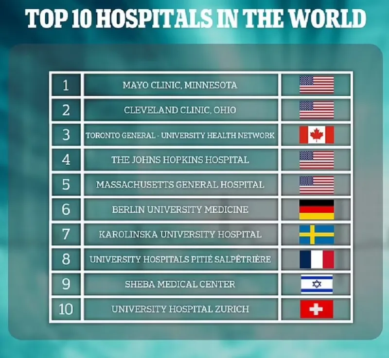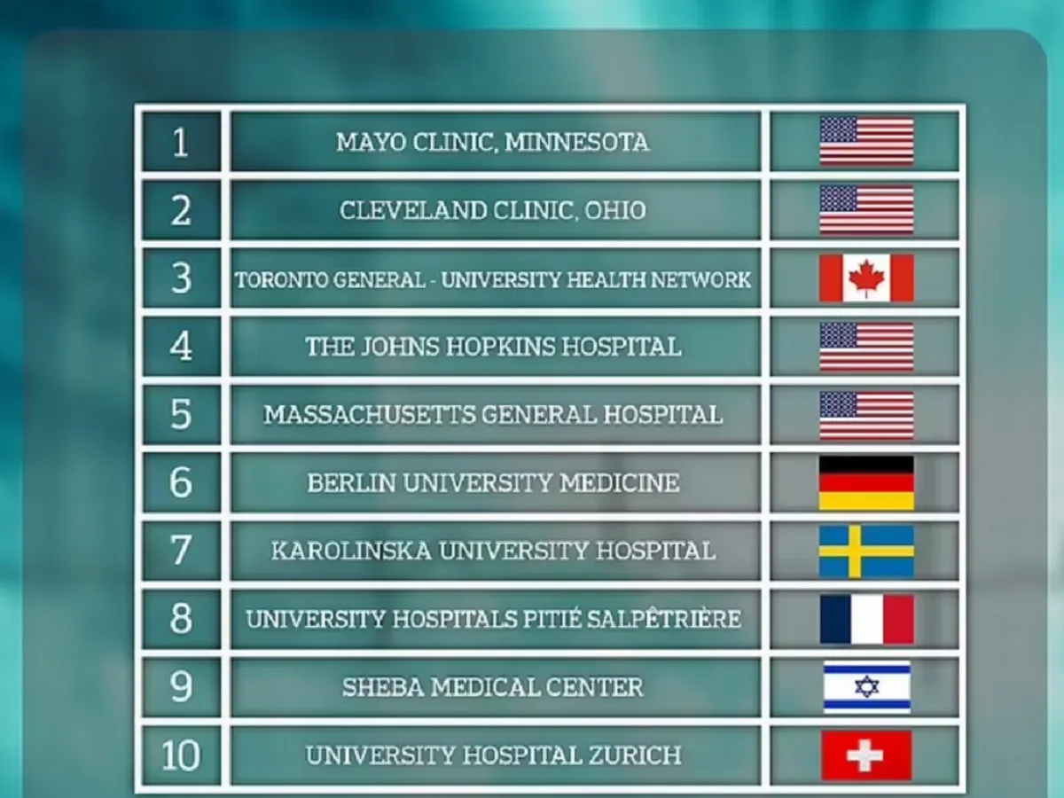 Raportul global, realizat de Newsweek.com și site-ul Statista, a inclus date despre 2.400 de spitale din 30 de țări.dezvăluie că patru din primele cinci sunt toate în America - clinicile Mayo și Cleveland ocupand primul și al doilea loc