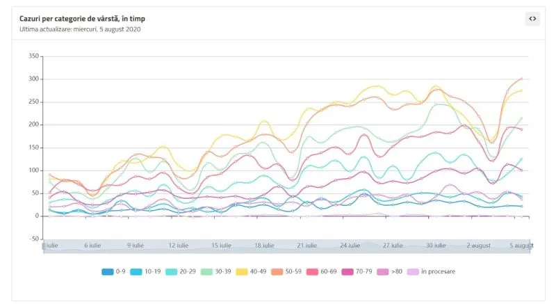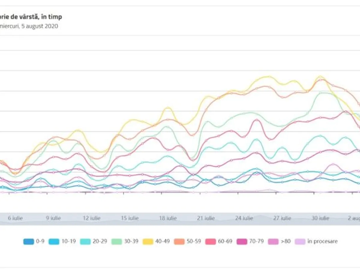 Vârful de infectări a fost înregistrat miercuri, 5 august, cu 1.309 persoane infectate, în condițiile în care România a trecut de nivelul de 1.000 de infectări zilnice pe 22 iulie.