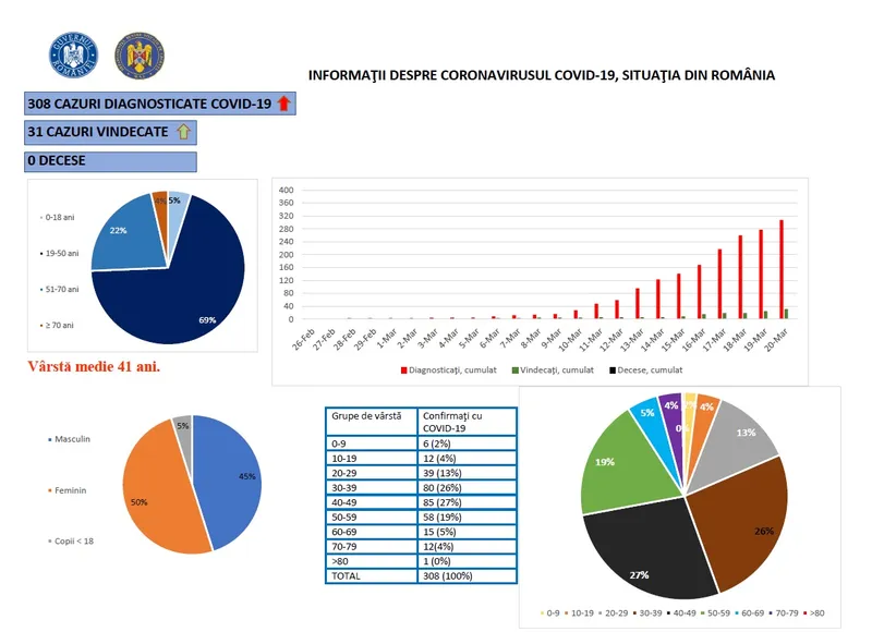 Grupul de Comunicare Strategică a anunțat că până astăzi, 20 martie, pe teritoriul României, au fost confirmate 308 cazuri de persoane infectate cu virusul Covid – 19. Dintre cele 308 de persoane confirmate pozitiv, au fost declarate vindecate și externate 31.