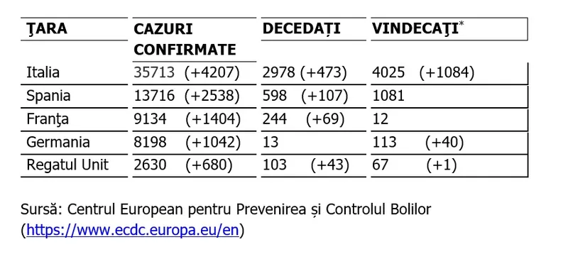 La nivel european, până în 19 martie, au fost raportate 82. 869 de cazuri în UE / SEE, Regatul Unit, Monaco, San Marino, Elveția, Andora. Cele mai multe cazuri au fost înregistrate în Italia, Franţa, Germania, Spania și Regatul Unit.