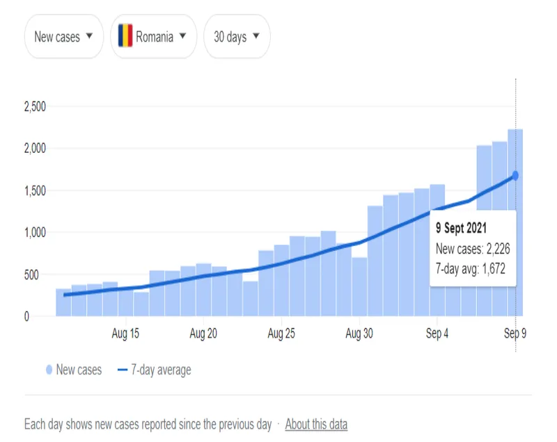 În urmă cu o lună, pe 11 august, aveam 326 de cazuri de coronavirus. Ieri, au fost anunțate 2.226, un record al ultimelor 30 de zile. Creșterea este de 6,8 ori. România a cunoscut și 10.000 de infecții pe zi, dar niciodată rata de amflicare a infecțiilor nu a fost atât de ridicată.
