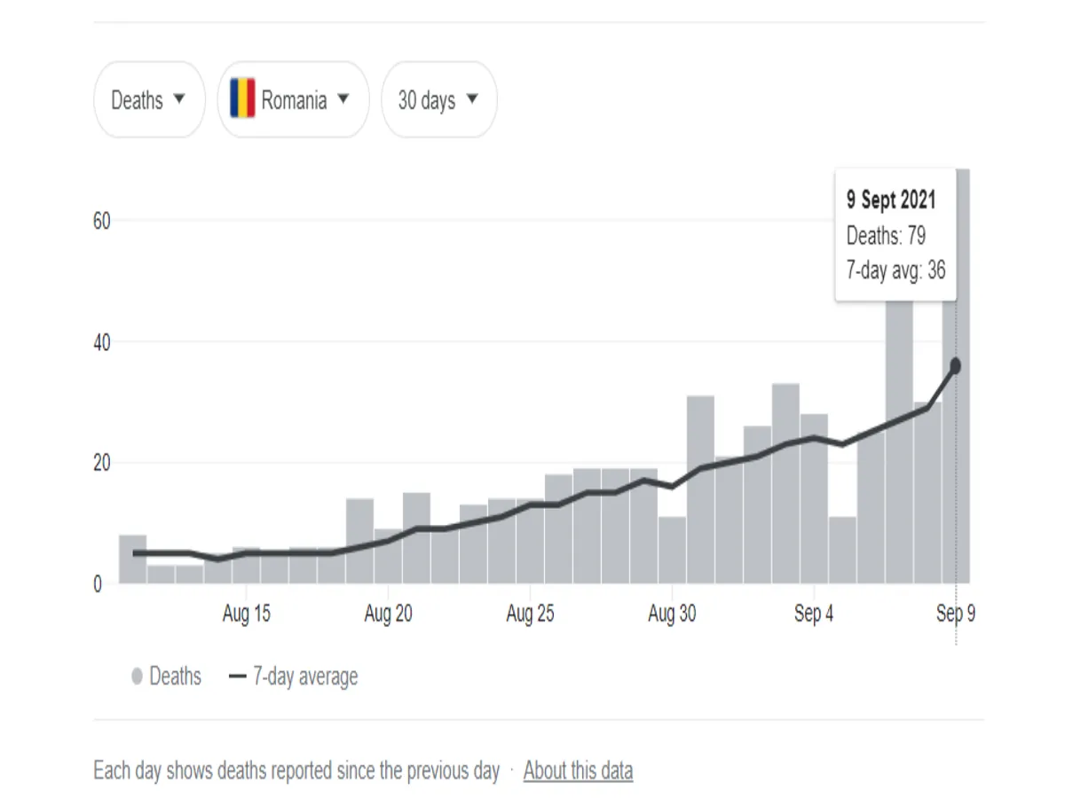 Numărul deceselor a crescut foarte rapid, de la sub 10 în urmă cu o lună la 79 ieri. Vorbim de o creștere de 3 (sau 8) decese la începutul lui septembrie față de 79 în cursul zilei de ieri.