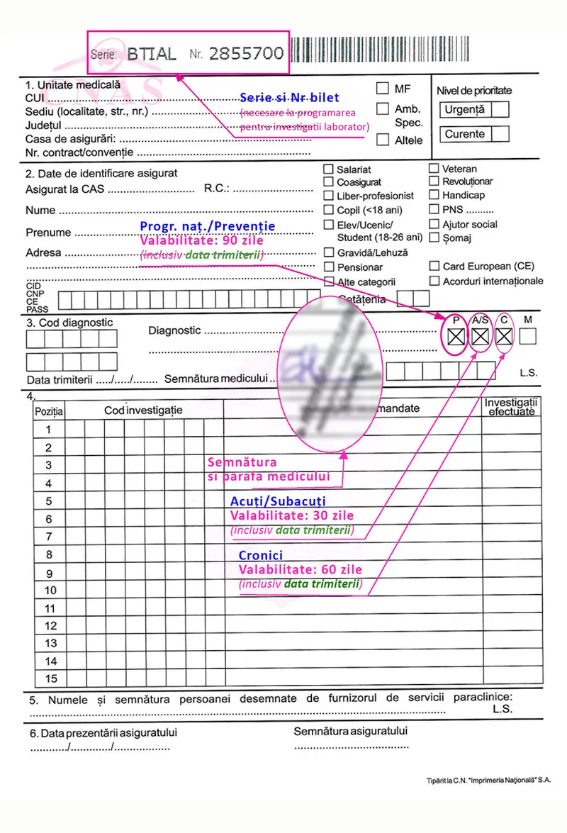 Fondurile CAS pentru analize se epuizează, în general, rapid, în fiecare lună. Există însă două mențiuni pentru care, dacă sunt trecute de medic pe biletul de trimitere, furnizorul de servicii prestează chiar dacă nu mai are bani de la Casa de Asigurări de Sănătate.