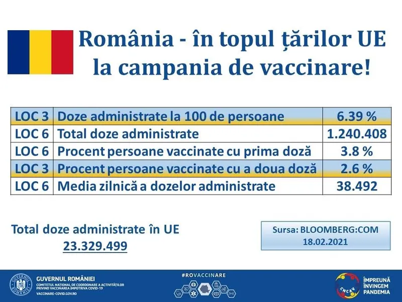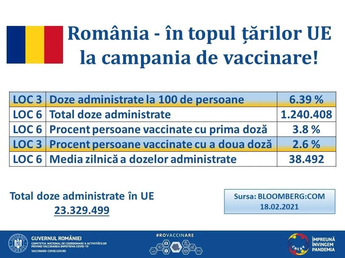 23,329,499 de doze de vaccin au fost administrate în țările membre UE, conform celor mai recente estimări făcute de Bloomberg, media zilnică fiind de 683,136. România se află în top.