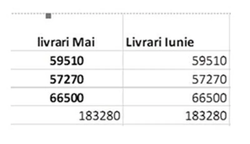 Cantitatea de cutii pe care producătorul Merck o va livra în România în lunile mai și iunie. Cele trei coloane corespund concentrațiilor Euthyrox de 25 micrograme, 50 micrograme, respectiv 100 micrograme.