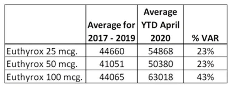 Astfel, în perioada 2017 – 2019, Merck a pus pe piață, în medie, 129.776 de cutii de Euthyrox, în vreme ce, în primele patru luni ale lui 2020, a pus pe piață 168.266 de cutii.