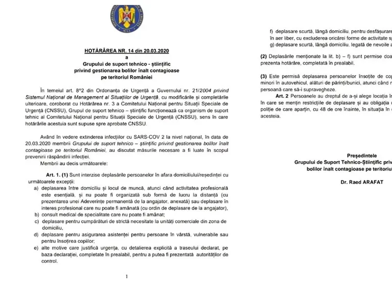 Prin hotărârea nr. 14 din 20.03.2020, semnată de Raed Arafat, toate deplasările trebuie justificate printr-o anexă ce va fi completată pe model francez. Forma nu este finală, conform jurnaliștilor de la Libertatea.
