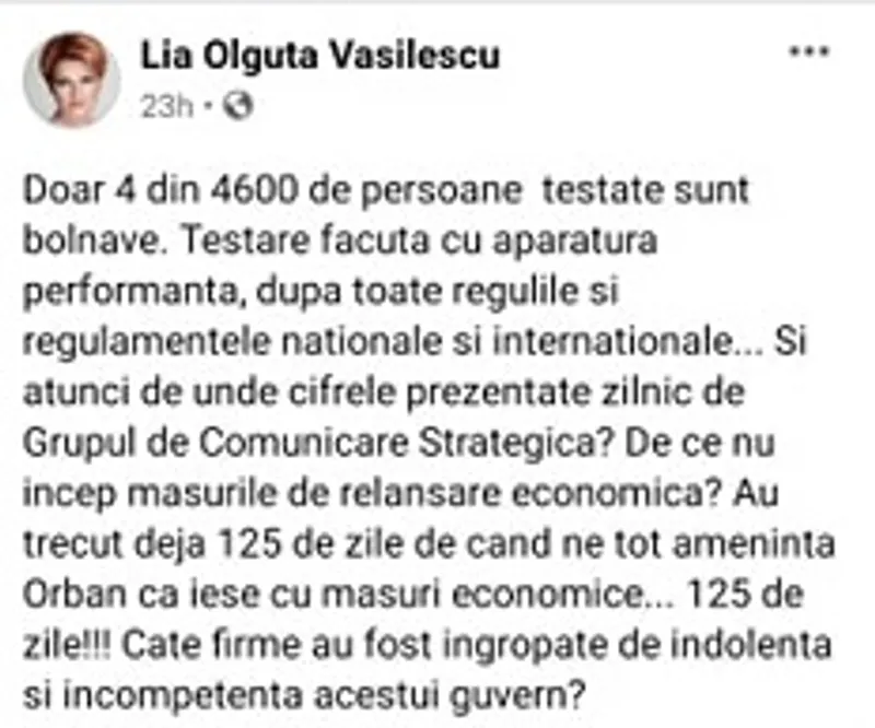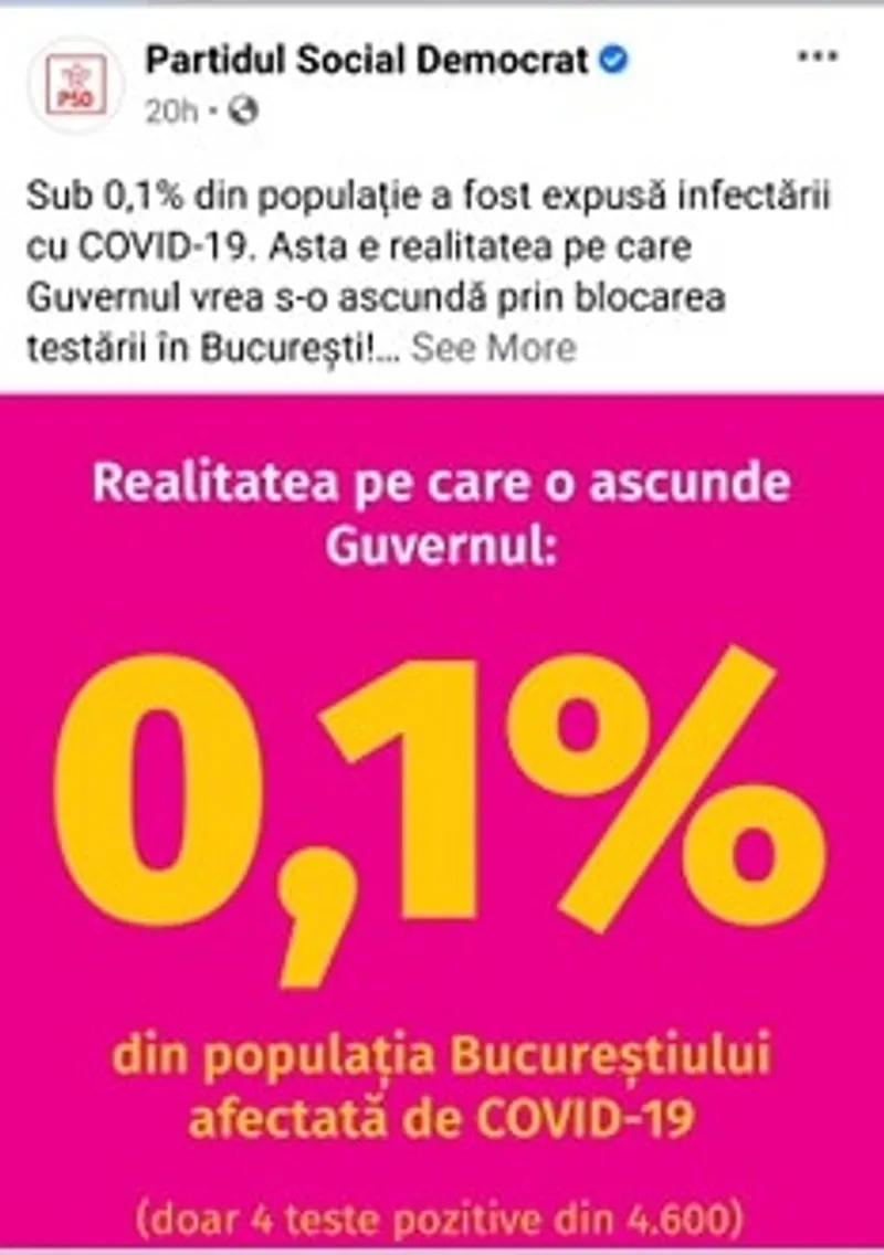 „Sub 0,1% din populație a fost expusă infectării cu COVID-19. Asta e realitatea pe care Guvernul vrea s-o ascundă prin blocarea testării din București! Doar 4 din 4.600 de teste PCR și doar 2 din cele 500 de teste anti-corpi (sic!) au fost pozitive, în cele două studii demarate de Primăria Capitalei. De ce nu vrea Guvernul să știm această realitate?”, a susținut PSD, pe pagina sa de Facebook. Ideea a fost preluată și de ex-ministra Muncii, Lia Olguța Vasilescu.