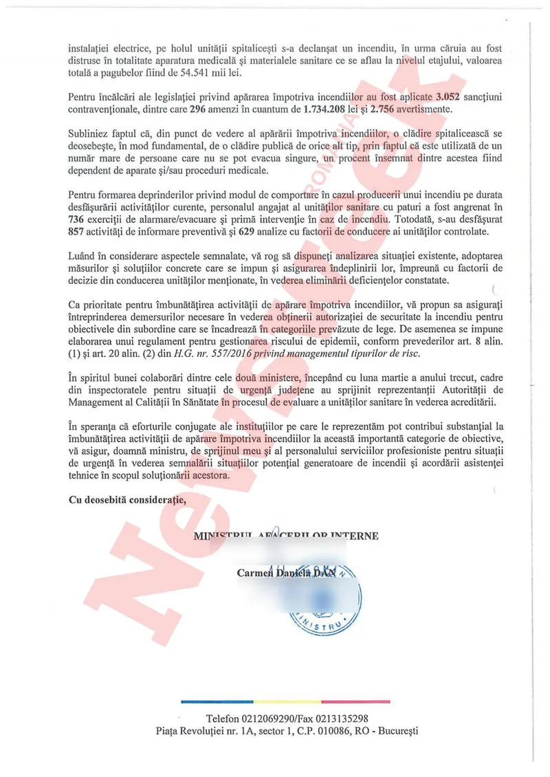 „Mă adresez dumneavoastră spre a vă informa cu privire la concluziile controalelor de prevenire executate de personalul inspectoratelor pentru situaţii de urgenţă judeţene şi Bucureşti-Ilfov la unităţile sanitare cu paturi.