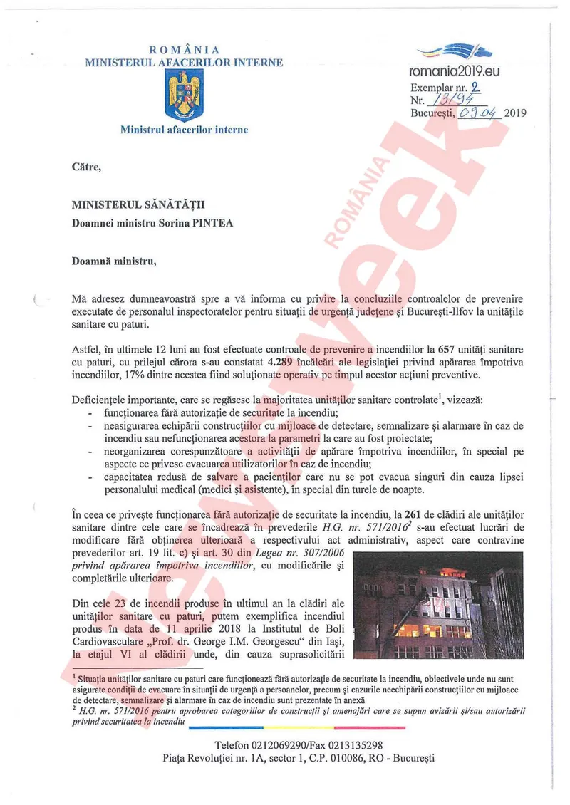 Astfel, în ultimele 12 luni au fost efectuate controale de prevenire a incendiilor la 657 unităţi sanitare cu paturi, cu prilejul cărora s-au constatat 4.289 încălcări ale legislaţiei privind apărarea împotriva incendiilor, 17% dintre acestea fiind soluţionate operativ pe timpul acestor acţiuni preventive”, scria Dan Iamandi, șeful Inspectoratului General pentru Situații de Urgență într-un raport adresat ministrului PSD al Sănătății, Sorina Pintea în aprilie 2019.