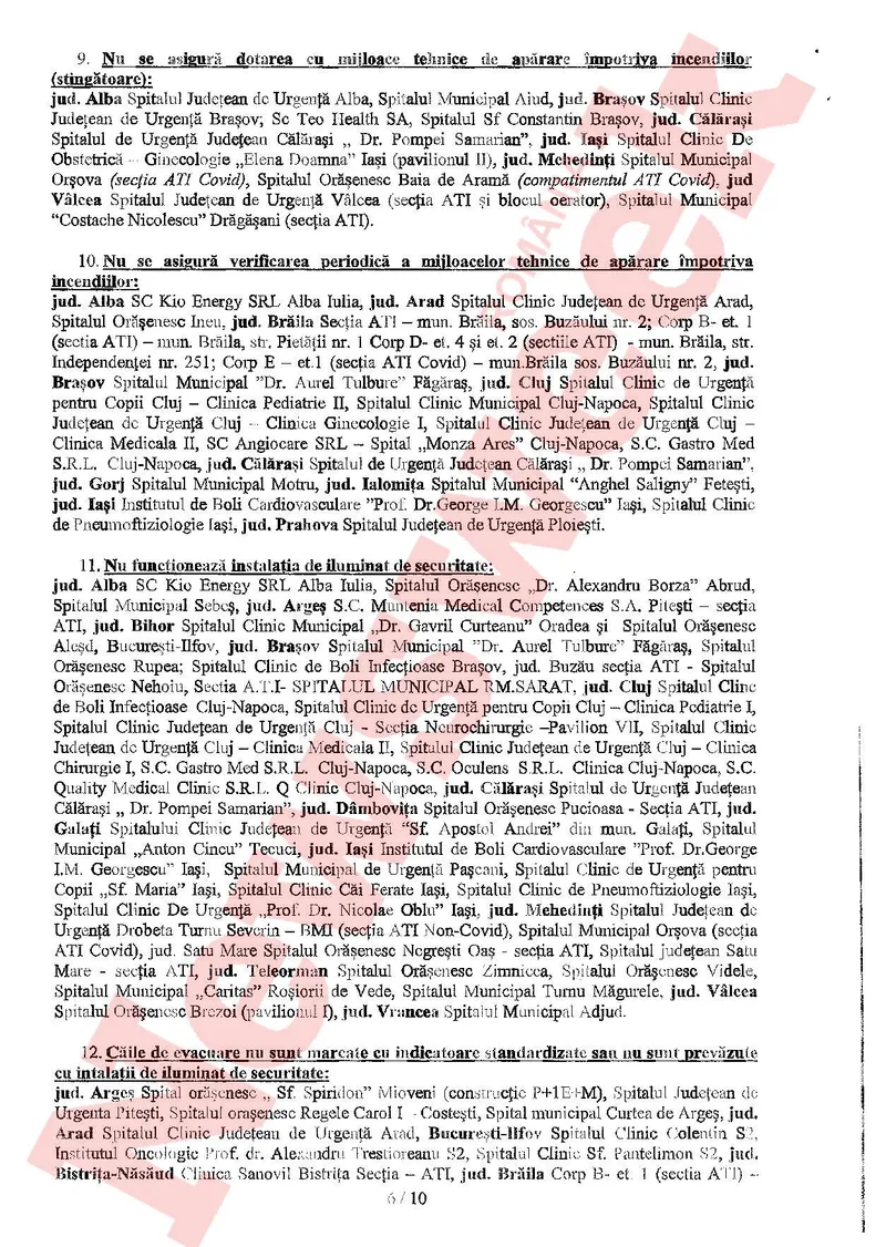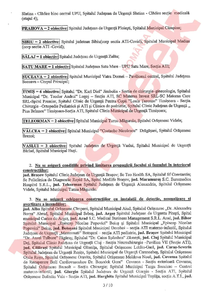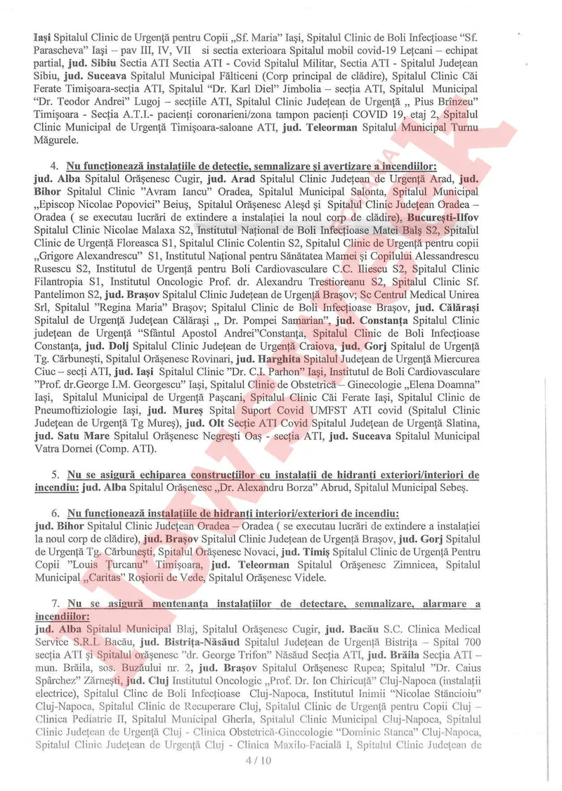 „Pentru încălcări ale legislaţiei privind apărarea împotriva incendiilor au fost aplicate 225 amenzi în cuantum de 1.046.602 lei şi 2.766 avertismente. Pentru formarea deprinderilor privind modul de comportare în cazul producerii unui incendiu pe durata desfăşurării activităţilor curente, personalul angajat al unităţilor sanitare cu paturi a fost angrenat în 576 exerciţii de alarmare/evacuare şi primă intervenţie în caz de incendiu. Totodată, sau desfăşurat 576 activităţi de informare preventivă şi 488 analize cu factorii de conducere ai unităţilor controlate”, menționează raportul intrat în posesia Newsweek România.