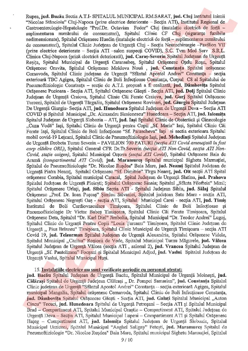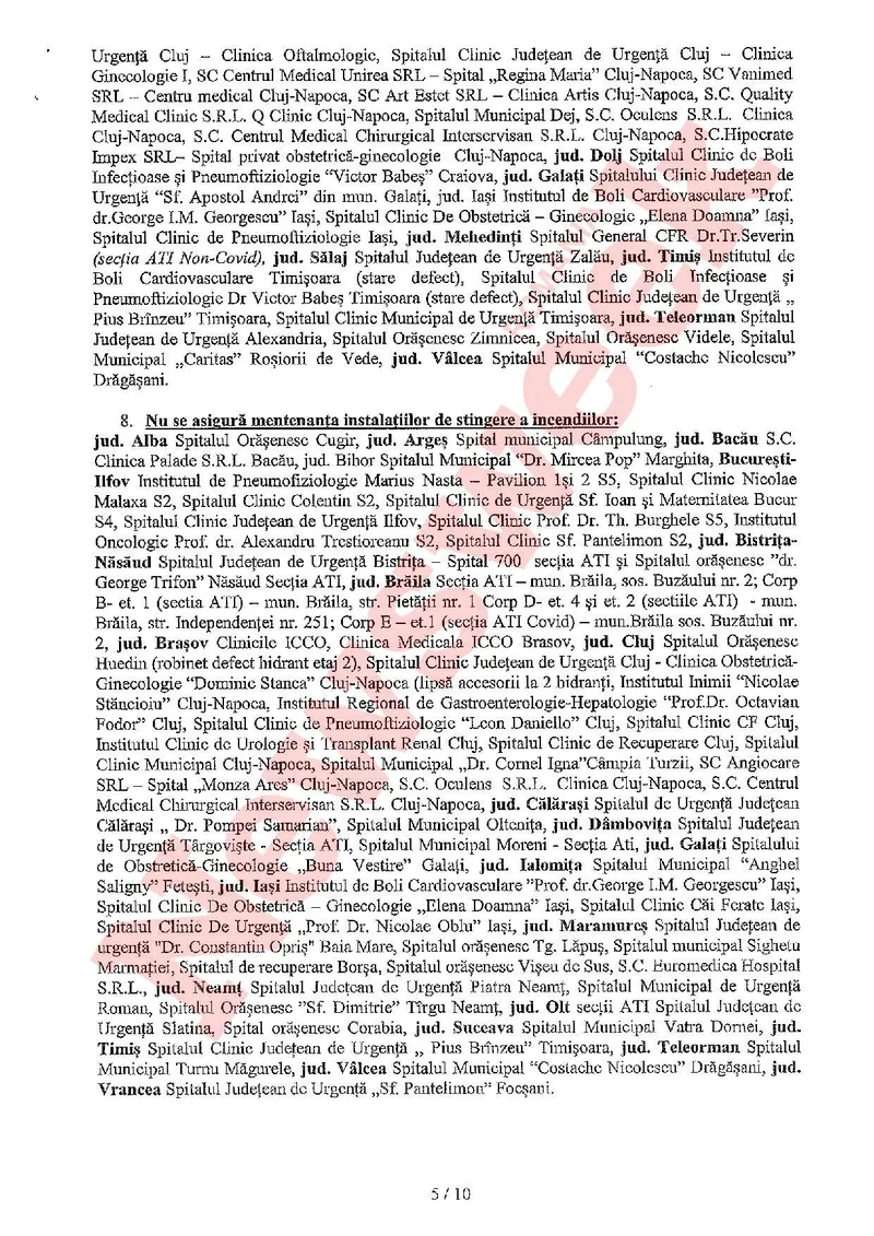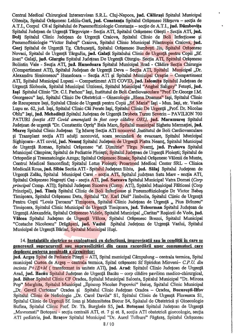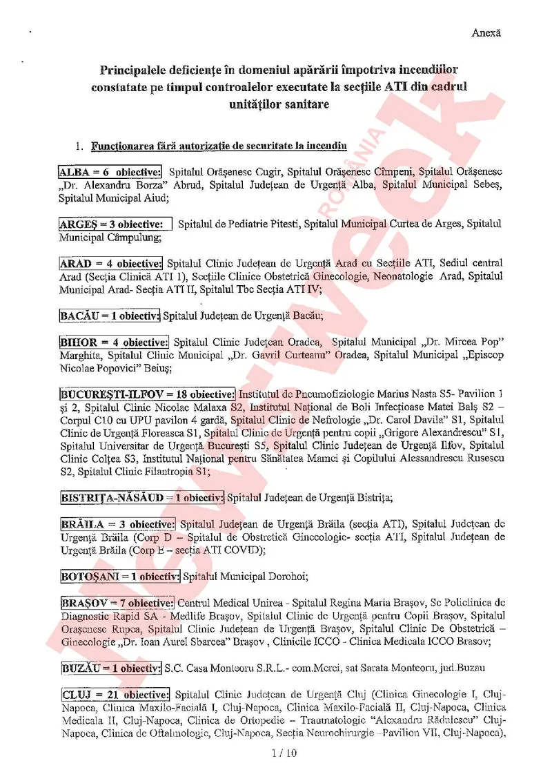 „Pentru încălcări ale legislaţiei privind apărarea împotriva incendiilor au fost aplicate 225 amenzi în cuantum de 1.046.602 lei şi 2.766 avertismente. Pentru formarea deprinderilor privind modul de comportare în cazul producerii unui incendiu pe durata desfăşurării activităţilor curente, personalul angajat al unităţilor sanitare cu paturi a fost angrenat în 576 exerciţii de alarmare/evacuare şi primă intervenţie în caz de incendiu. Totodată, sau desfăşurat 576 activităţi de informare preventivă şi 488 analize cu factorii de conducere ai unităţilor controlate”, menționează raportul intrat în posesia Newsweek România.