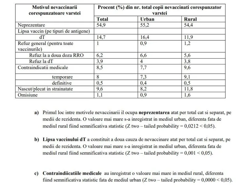 dintre ei, 60,9 la sută provin din mediul urban, iar 39, 1 la sută din mediul rural, potrivit unui document al CNSCBT, din luna februarie 2018.Refuzul în cazul vaccinului ROR (RRO) a avut cea mai mare pondere în cadrul refuzului general, înregistrând o valoare mai mare în mediul urban. Cel mai mare procent de copii cu refuz la vaccinarea cu ROR din eșantionul studiat a fost înregistrat în județul Dolj (30,4%) urmat de județul Giurgiu (30%) si de județul Constanța (23,1%).