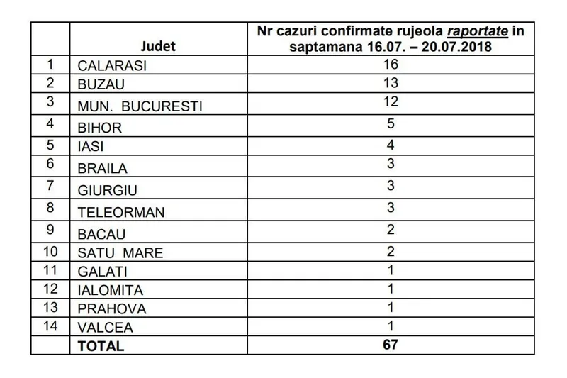 Numărul bolnavilor de rujeolă a crescut cu 67, în perioada 23-27 iulie, a anunțat Centrul de Național de Supraveghere și Control al Bolilor Transmisibile (CNSCBT). Cazurile nou confirmate s-au înregistrat în 13 județe și București.