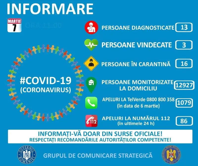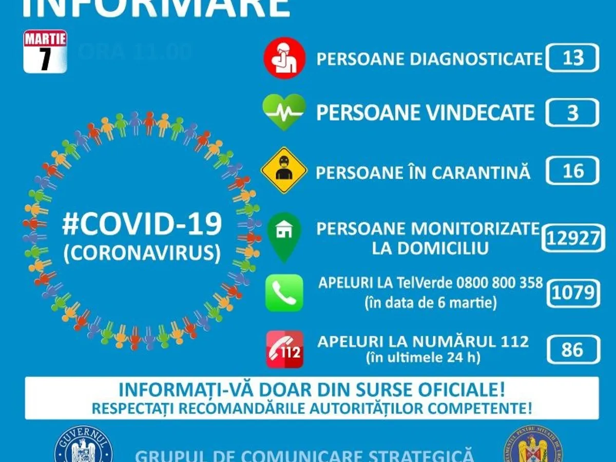 Până pe 7 martie, pe teritoriul României au fost confirmate 13 cazuri de infectare cu virusul COVID-19 (coronavirus). Trei dintre persoanele depistate infectate au fost declarate vindecate și externate deja, anunță Grupul de Comunicare Strategică al Guvernului.