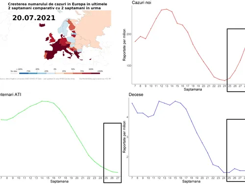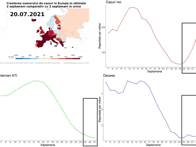 Graficele reprezintă evoluția numărului de cazuri noi de infecție, de internări în ATI și decese raportate la 1 milion de persoane din săptămânile 7 până la 29, respectiv 27 (internări ATI) ale anului 2021.