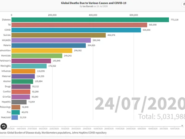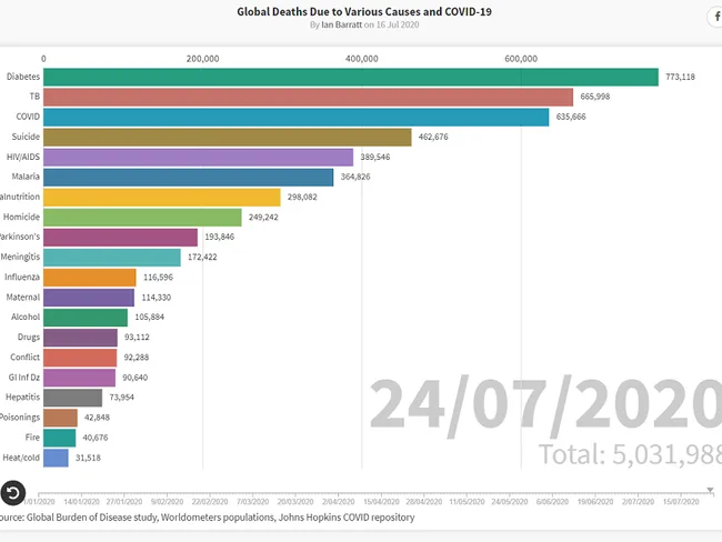 Un privind numărul de decese la nivel global din diverse cauze, printre care și COVID-19, care a luat în calcul datele prezentate de Global Burden of Disease study, Worldometers populations, Johns Hopkins COVID repository, arată exact situația din momentuld e față.