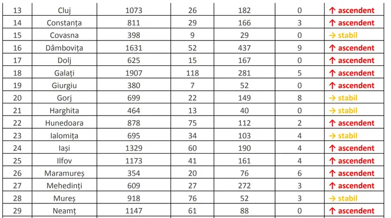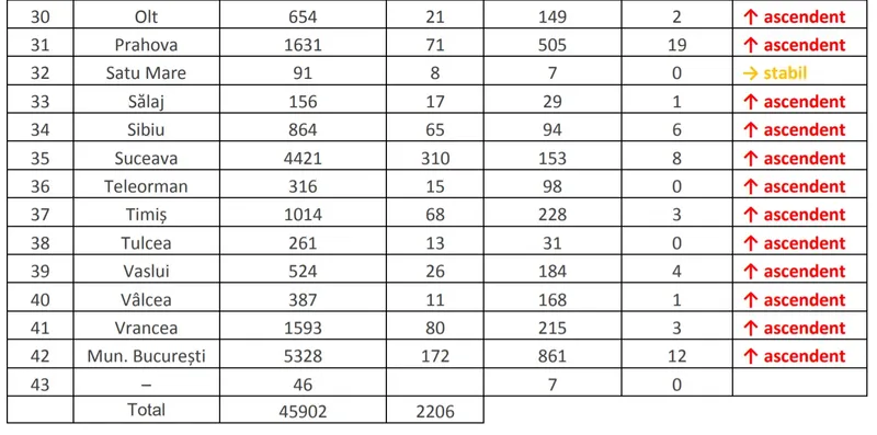 De asemenea, INSP mai arată că se înregistrează un trend ascendent în ceea ce priveşte îmbolnăvirile de COVID-19, faţă de săptămâna anterioară, în 34 de judeţe şi municipiul Bucureşti.