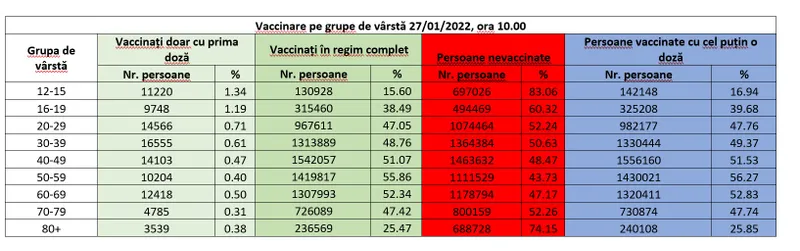 Rate scăzute de vaccinare se înregistrează și în rândul vârstnicilor de peste 80 de ani, unde procentul nevaccinaților este de peste 74 la sută, arată datele Comitetului Național pentru Coordonarea Vaccinării (CNCAV) valabile pentru 27 ianuarie (tabelul, mai jos):