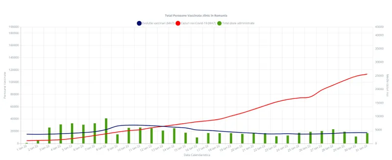 Din 13 ianuarie, graficul creat de Graphs.ro arată cum numărul de cazuri noi începe să crească semnificativ, în timp ce vaccinările descresc. Pentru 31 ianuarie, media aritmetică a cazurilor de COVID din ultimele șapte zile este 25.609, în timp ce media vaccinărilor pe ultimele șapte zile este de 17.555.