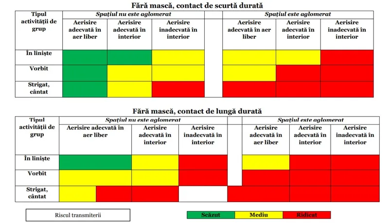 - Contactul de lungă durată: persoana asimptomatică poate transmite virusul chiar dacă stă în aer liber, dar strigă, în interior – dacă strigă, iar dacă încpăerea nu e aerisită crespunzăor, poate transmite virusul indiferent ce face. Dacă spațiul este și aglomerat, transmite virusul și dacă este în aer liber și dacă este un spațiu închis.