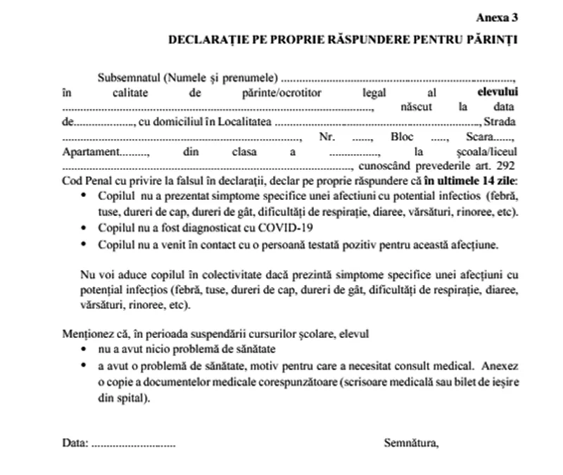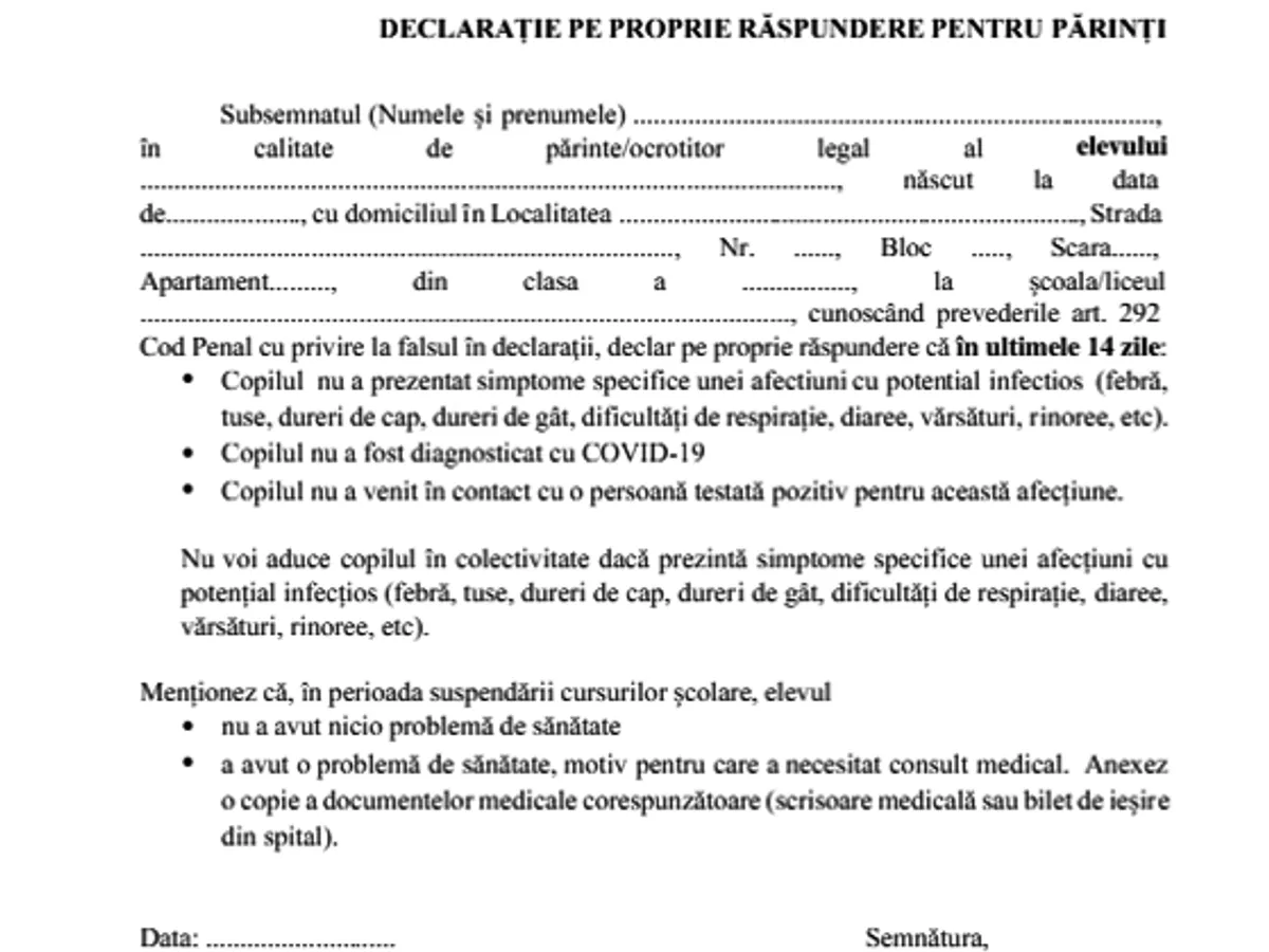 Declarația pe propria răspundere pe care părinții trebuie să o completeze astfel încât să arate că elevii nu au simptome de COVID menționează un articol de Cod Penal care ar trebui să se refere la "falsul în declarații". De fapt, se referă la "cumpărarea de influență".
