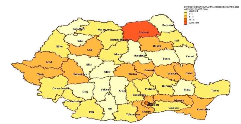 Sunt, în medie, 8,77 de cazuri confirmate de coronavirus la 100.000 de locuitori. Cea mai mare incidență cumulată este în județul Suceava, arată Institutul de Sănătate Publică, care analizează situația cazurilor de coronavirus, la o lună de la primul caz confirmat în România.