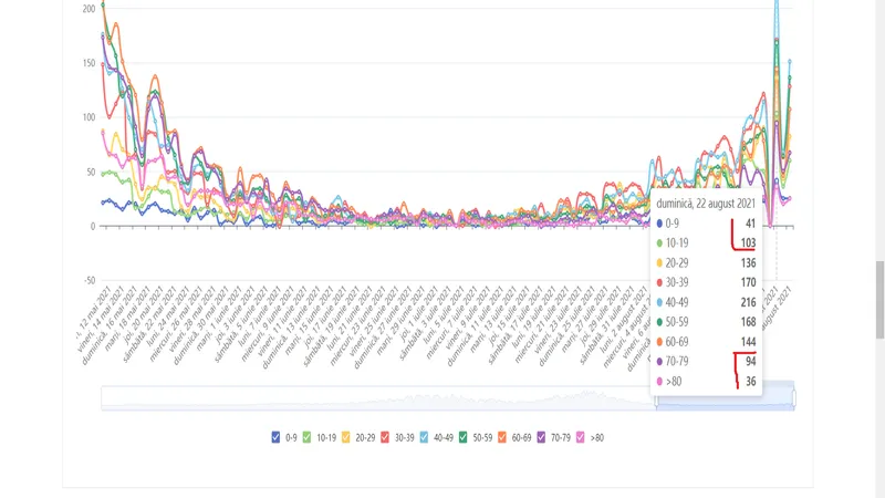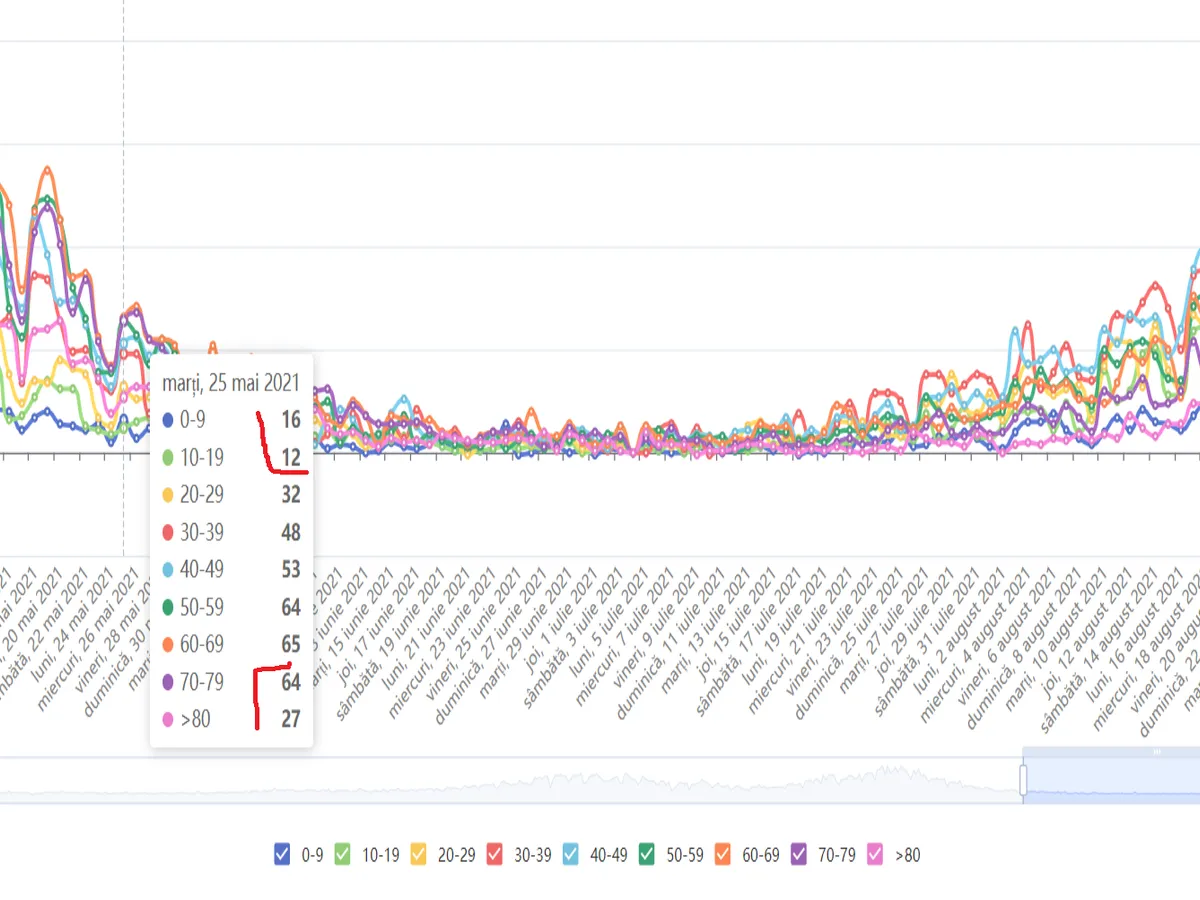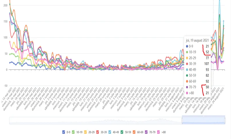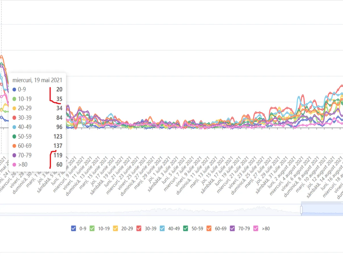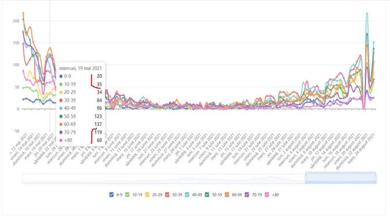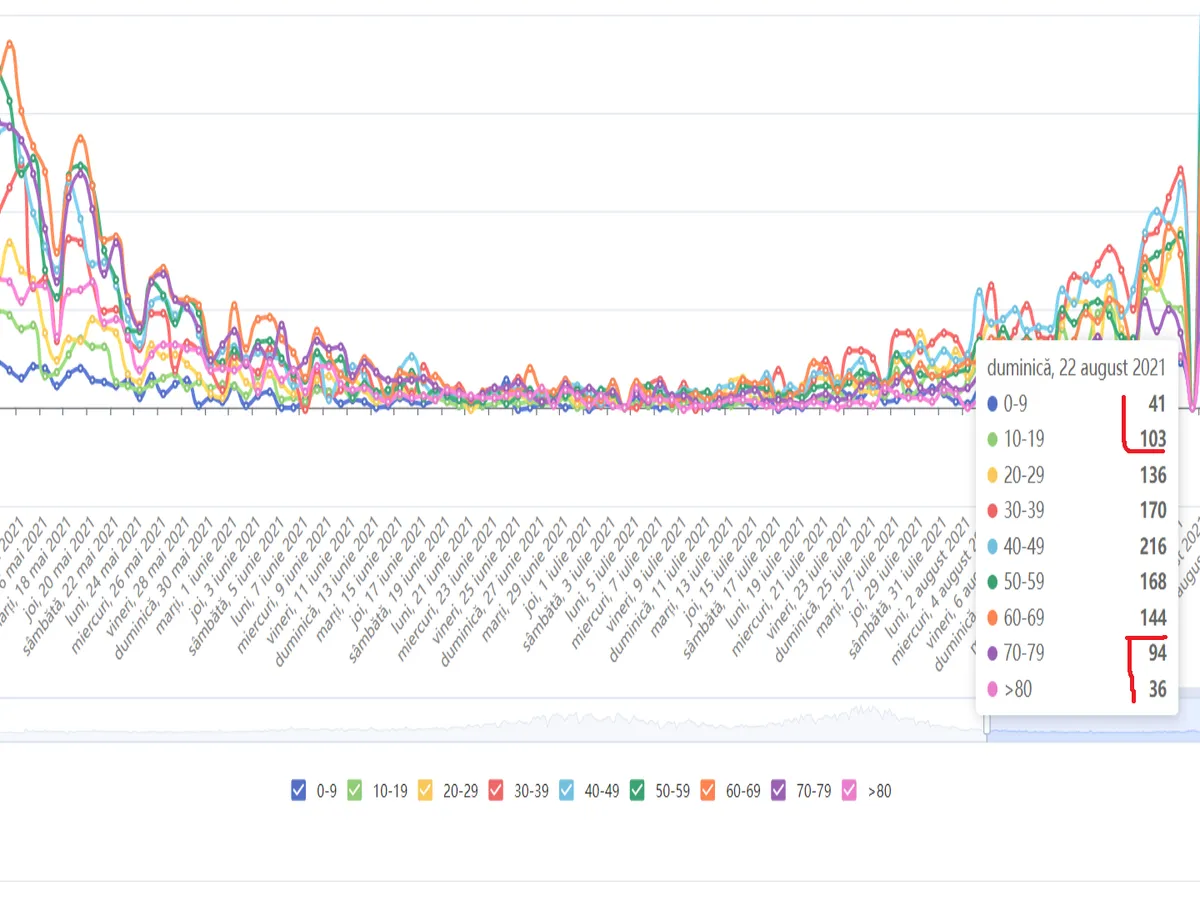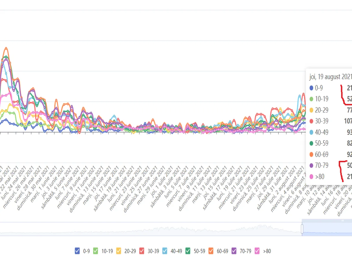 Graficul infectărilor pe grupe de vârstă, publicat de datelazi.ro, arată că după data de 15 august numărul infecțiilor zilnice la copii a fost aproximativ egal cu cel al persoanelor de peste 70 de ani.