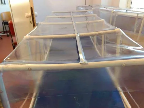 Folie de acoperit solarul, câteva țevi de polipropilenă folosite în instalațiile de încălzire și imaginație cât cuprinde. Pe post de zonă de aerisire s-a montat o ușă de plastic folosită la toaletele de apartament, fără deschidere! Așa au apărut pe holuri izolete handmade sub licență oficială a Spitalului Municipal Urziceni.