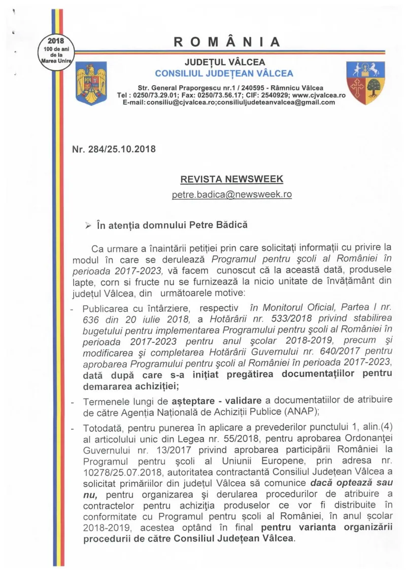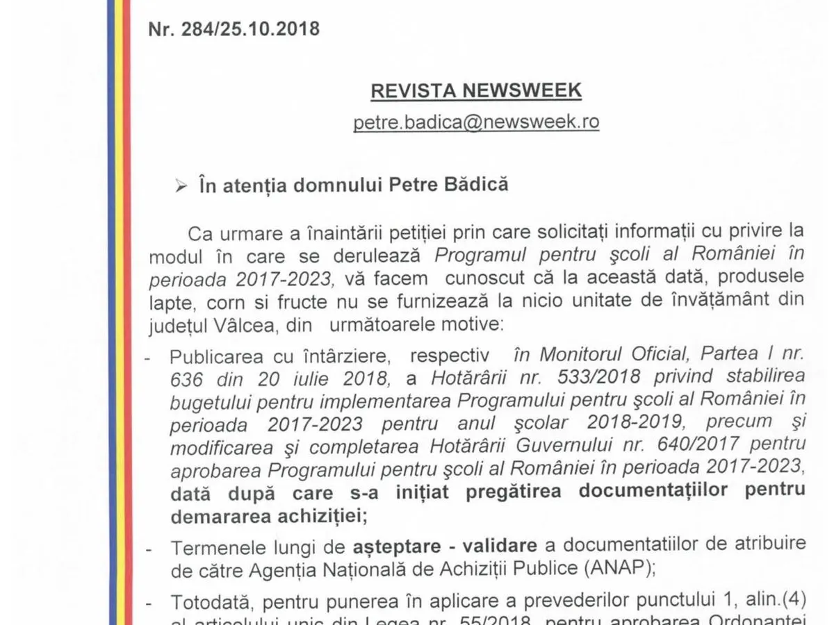 Ultimul județ care a confirmat pentru Newsweek România că nu distribuie gustarea zilnică gratuită către elevi este Vâlcea. Într-un răspuns, în exclusivitate, președintele Consiliului Județean Vâlcea, Constantin Rădulescu, susține că „produsele lapte, corn și fructe nu se furnizează la nicio unitate de învățământ din județul Vâlcea din următoarele motive: