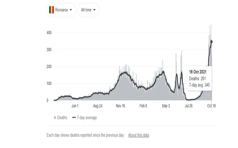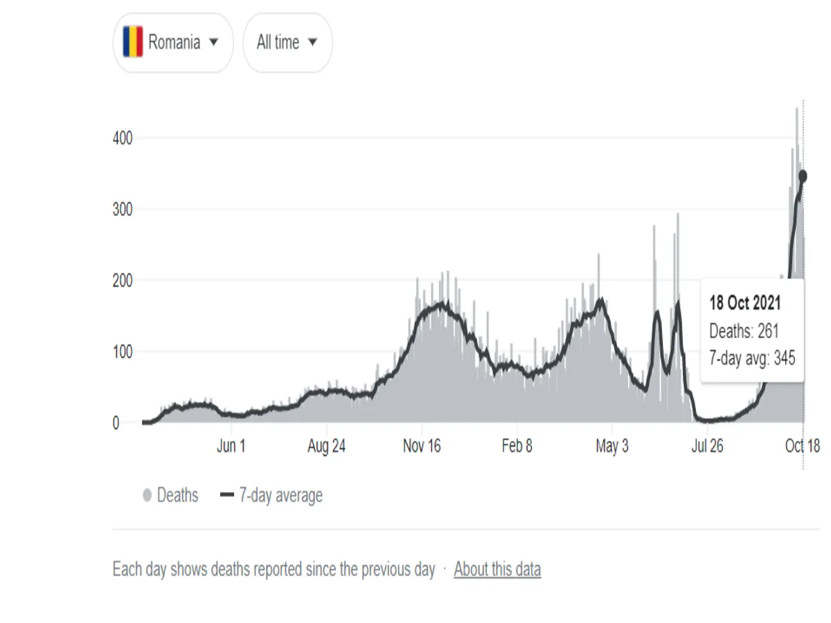 În cursul zilei de ieri, s-au înregistrat 261 de decese de COVID în România la o medie zilnică pe o săptămână de 341. Comparativ cu Marea Britanie, în România se moare de COVID de 6 ori mai mult (raportat doar la ziua de ieri) sau de 3 ori mai mult (dacă se face media zilnică săptămânală).