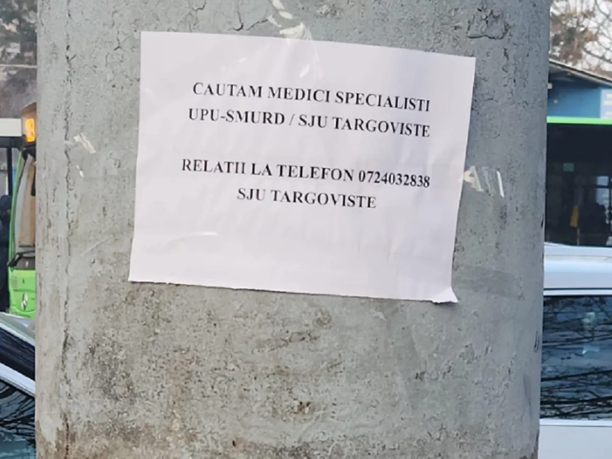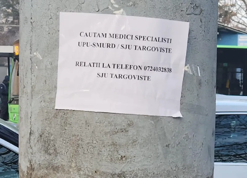 ”Căutăm medici specialiști UPU-SMURD/ SJU Târgoviște. Relații la telefon 0724 032 838 SJU Târgoviște”, scrie pe anunțul de pe anunțul lipit pe un stâlp lângă o unitate medicală din Capitală.