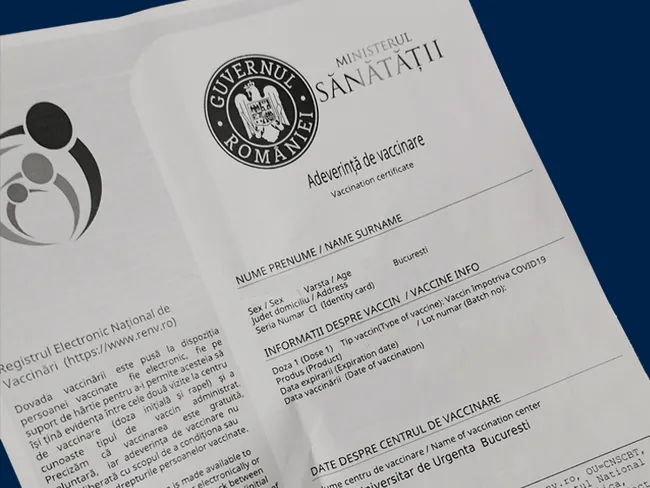 - pentru adeverința de vaccinare: tipul vaccinului și producătorul, numărul de doze, data vaccinării;