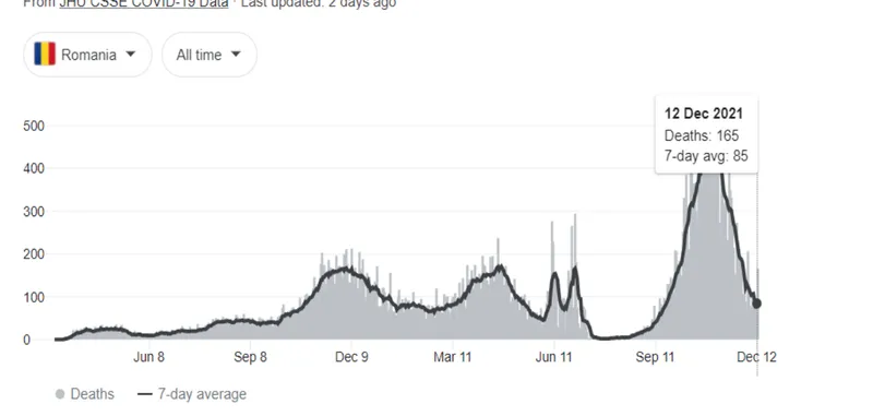 România – număr decese (media ultimei săptămâni): 85. Număr infecții noi (media ultimei săptămâni): 1.016. Raport infectări/decese: 12. Procent vaccinați complet: 38%.