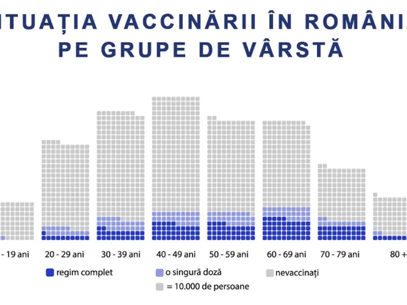 – 16-19 ani: schemă completă de vaccinare 14.815 persoane; cu o singură doză 37.277 persoane; persoane nevaccinate 767.585.