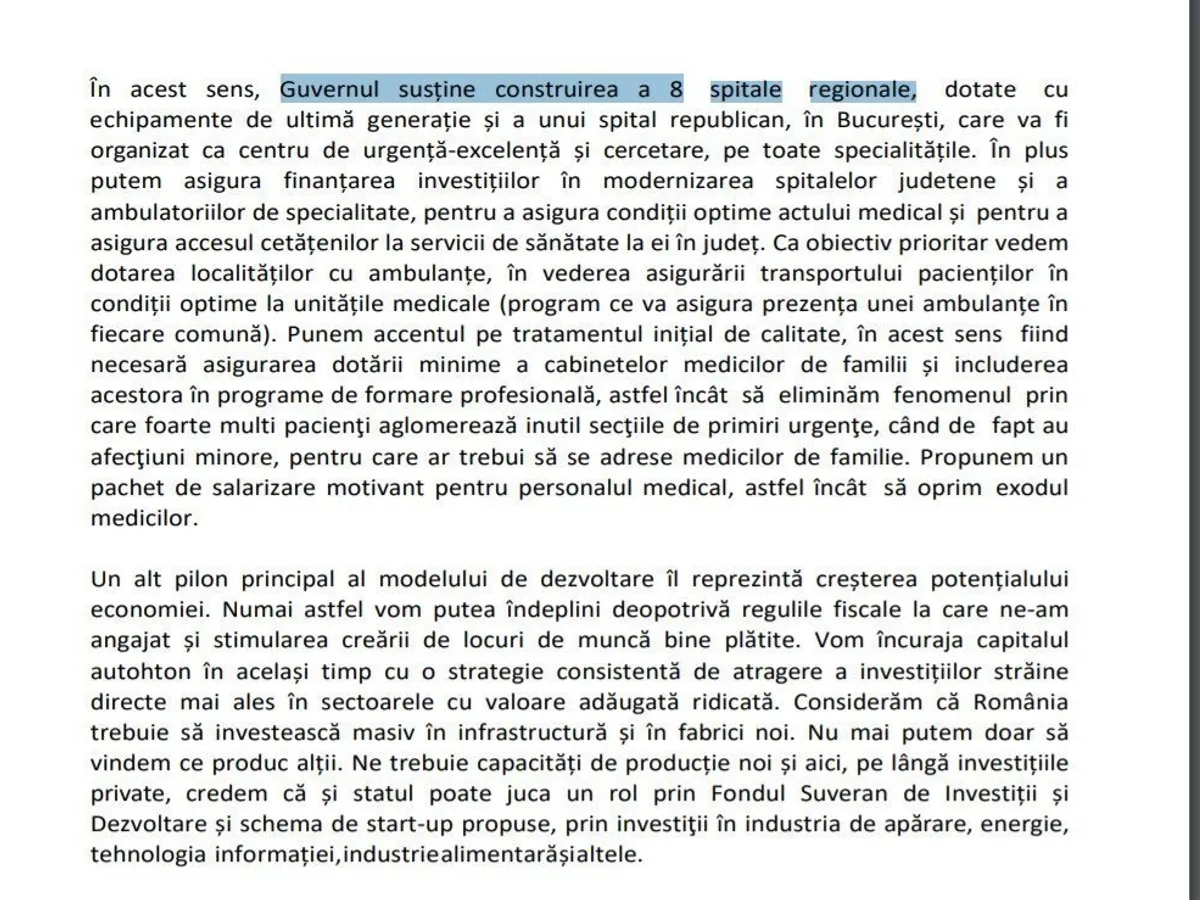 „Viziunea principală a programului Guvernului în domeniul sănătății este construită în jurul cetățeanului și nu a sistemului medical, scopul final fiind acela ca serviciile de sănătate să fie câtmai aproape de cetățean. 3 În acest sens, Guvernul susține construirea a 8 spitale regionale, dotate cu echipamente de ultimă generație și a unui spital republican, în București, care va fi organizat ca centru de urgență-excelență și cercetare, pe toate specialitățile”, se arată în Programul de guvernare PSD din 2016.
