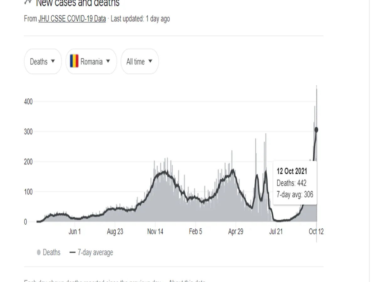 În graficul de mai jos vedeți modul în care a evoluat pandemia de coronavirus din perspectiva deceselor zilnice. Recordul deceselor de coronavirus a fost atins, ieri, când 442 de persoane au decedat. Graficul arată că valul al IV-lea nu a ajuns la platou pentru ca, apoi, să descrească. Cel mai probabil numărul infectărilor și al deceselor va mai crește câteva zile, poate săptămâni.