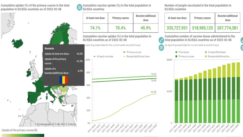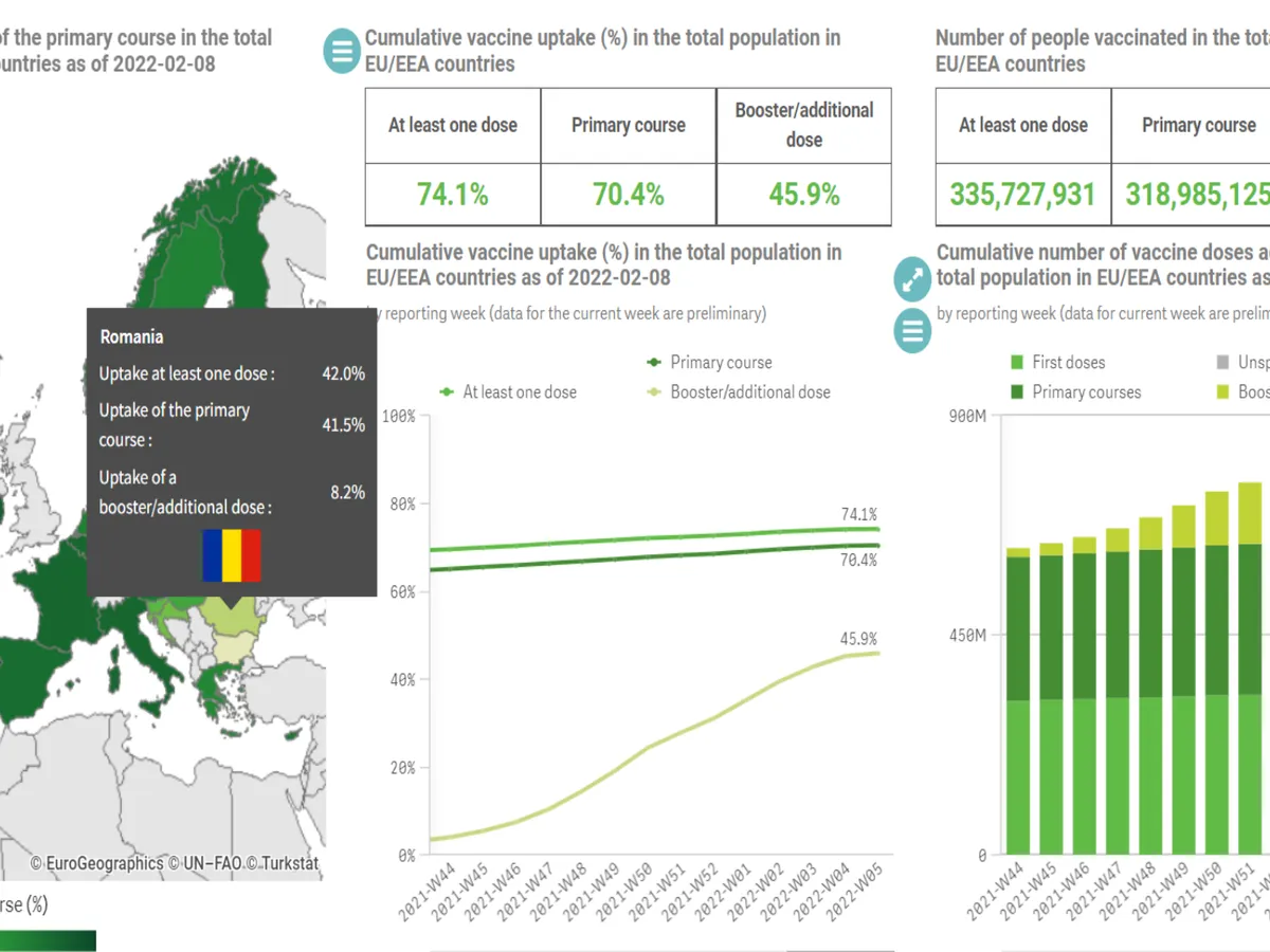 La nivelul UE, s-au vaccinat, cu cel puțin o doză, 71% din populație, iar cu doza cu booster 45% din populație.